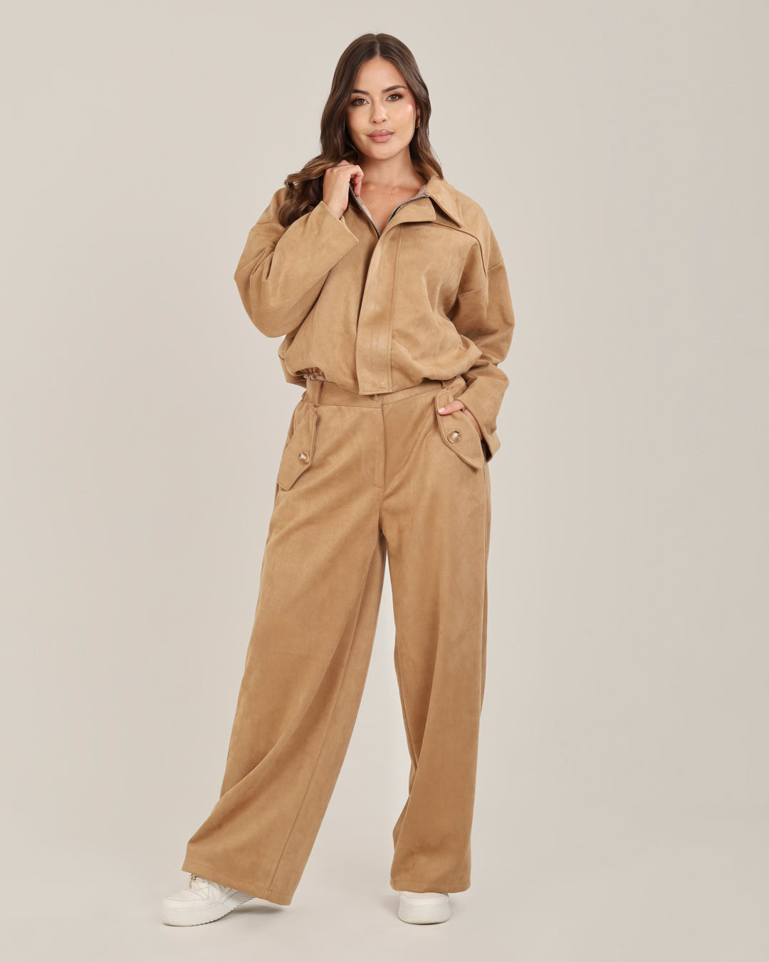 Chaqueta con textura de gamuza y cierre metálico, que evoca el misterio de un atardecer invernal. Ideal para un look monocromático de elegancia profunda.