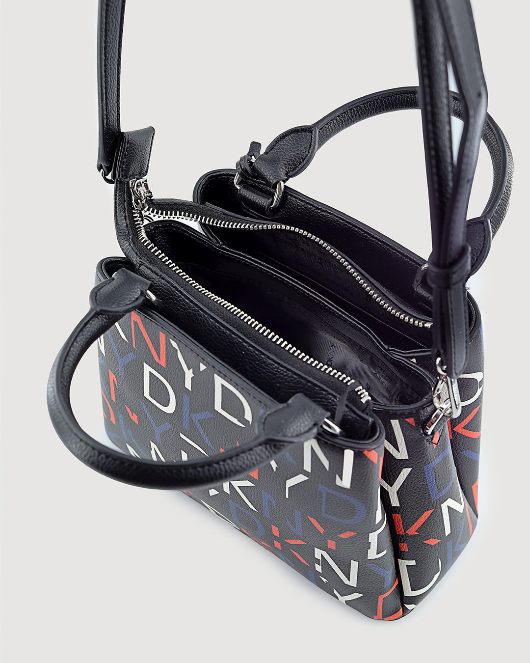 Bolso DKNY con estampado de logotipo gráfico en colores vibrantes. Asa superior y correa desmontable. El accesorio perfecto para un toque de estilo urbano audaz.