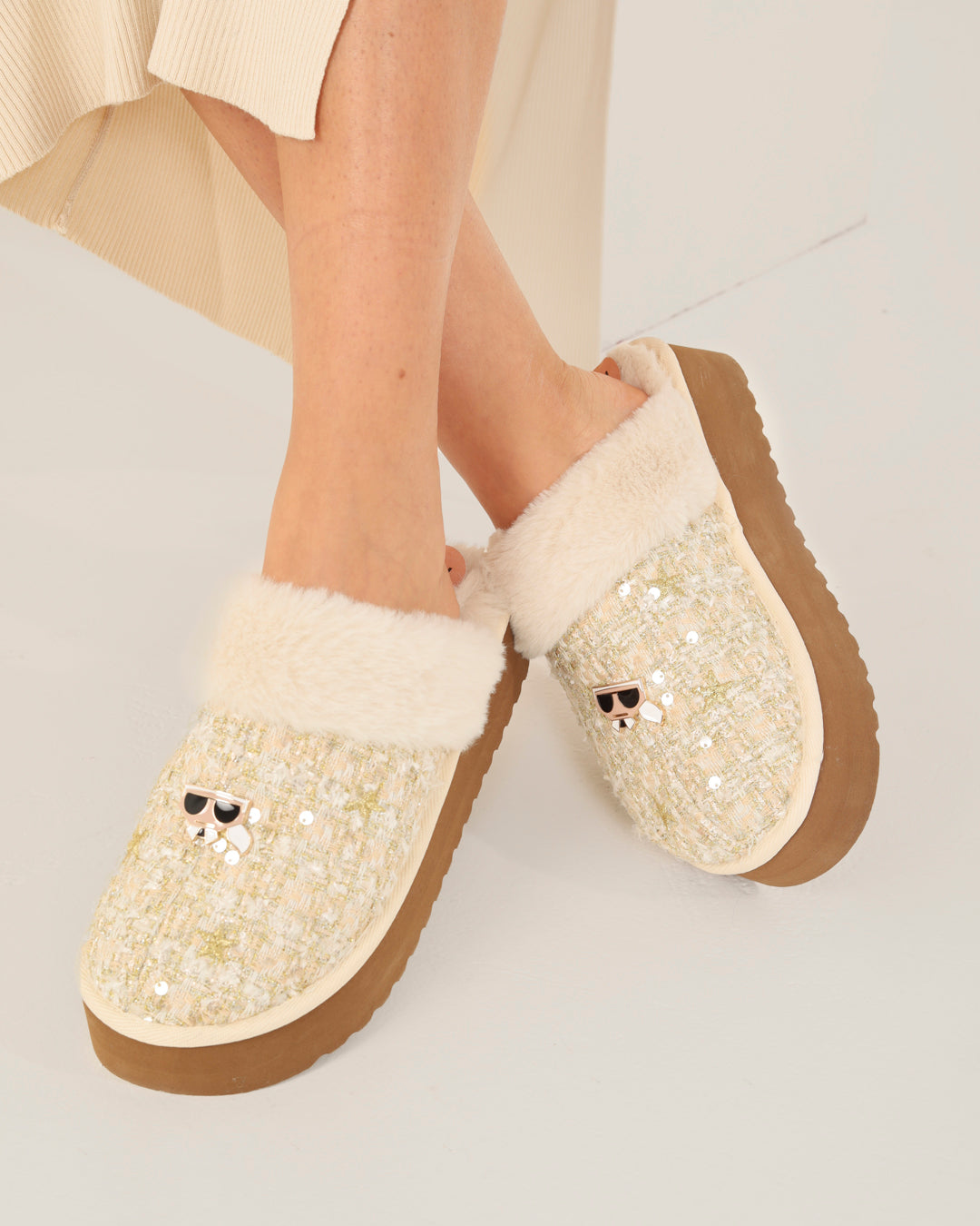 Zapatos con suela de plataforma de estilo chunky que combina comodidad extrema y altura. El tejido tweed iridiscente con destellos dorados y el forro de pelo sintético hacen de este el calzado ideal para un lujo acogedor.