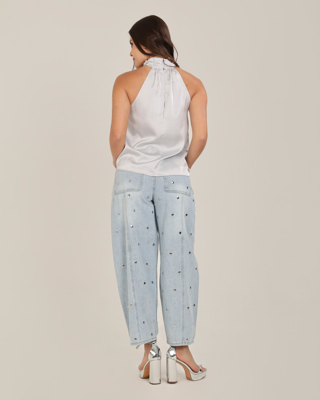 Top estilo halter en satín plateado o gris perla. Su cuello anudado imita la caída de un pañuelo de lujo, dándole una elegancia minimalista y celestial.
